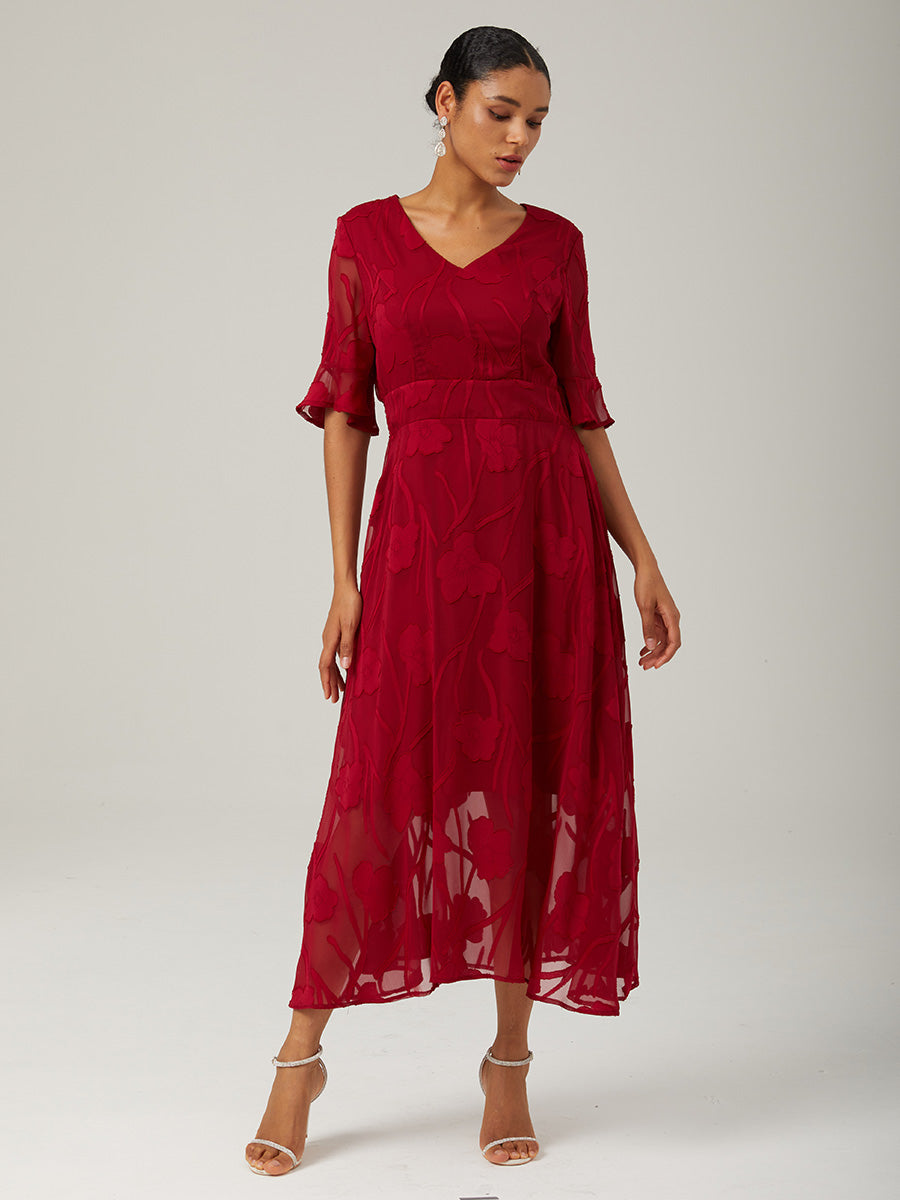 這款蕾絲洋裝帶有優雅氣息,非常適合婚禮賓客或雞尾酒會造型。以精緻的V領和柔美的荷葉袖設計,洋裝呈現經典的A字裙輪廓,搭配細緻的荷葉邊細節,增添優雅魅力。
